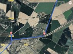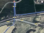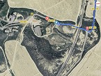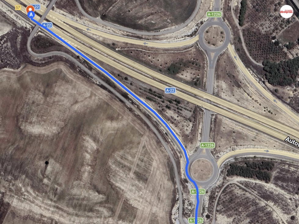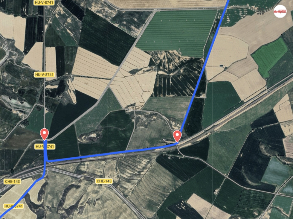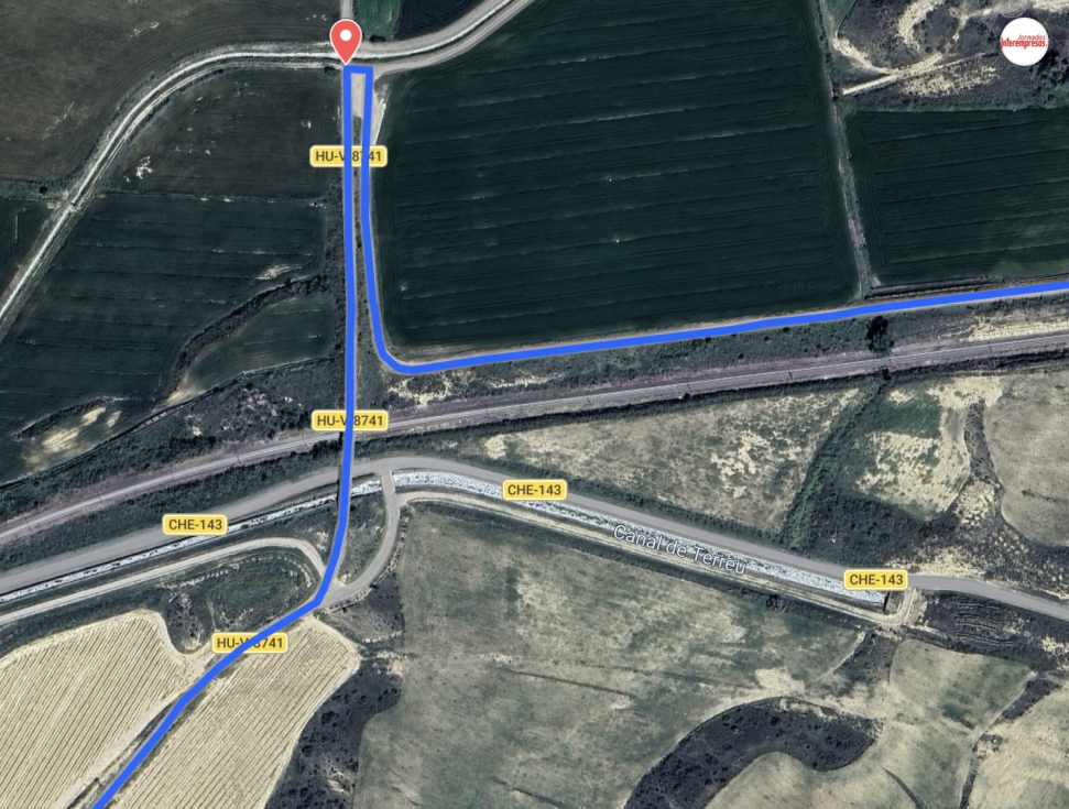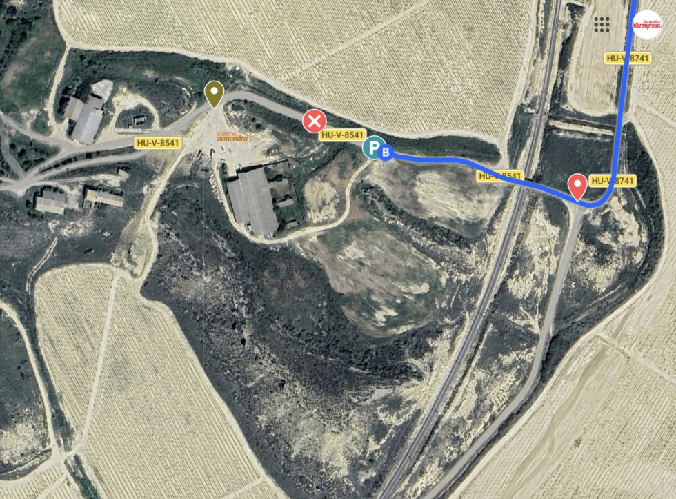 - Al llegar al cruce con la carretera HU-V-8741, marcado en la imagen, hacer el giro completo y coger la carretera HU-V-8741 en sentido contrario al que llegamos al cruce. Continuar todo recto por encima de las vías del tren, hasta encontrar señalización con bandera.