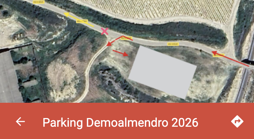 - En este punto de la carretera HU-V-8741 habrá una bandera que señalizará el acceso a la finca donde se desarrollará Demoalmendro 2026.